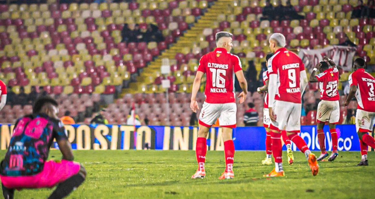 El Campín volvió a recibir fútbol, pero el arranque fue cuesta arriba. Deportivo Pereira se puso en ventaja con gol de Marco Pérez al minuto 41, aprovechando una jugada mal resuelta por la defensa cardenal gracias al mal estado de la cancha. Santa Fe intentó, pero no encontró claridad ni conexiones en la primera mitad.